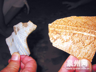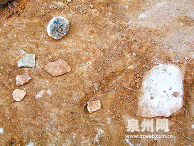 日前,三班鎮(zhèn)一農(nóng)民在寮田尖山柑橘園內(nèi)挖出一些古陶瓷碎片。6日,泉州市考古隊和德化縣博物館工作人員現(xiàn)場考察后初步認定,這些陶瓷碎片的發(fā)現(xiàn)處為古窯址,部分碎片為我市首次發(fā)現(xiàn)的商周時期原始青瓷。據(jù)悉,此前我市發(fā)現(xiàn)最早的瓷器生產(chǎn)窯址是晉江溪口山青瓷窯址,為南朝時期古窯址。這一發(fā)現(xiàn)有望填補我市陶瓷燒制歷史從硬陶到青瓷過渡的空白,并將泉州瓷器生產(chǎn)歷史向前推進1000—2000年,對研究古陶瓷生產(chǎn)意義深遠。