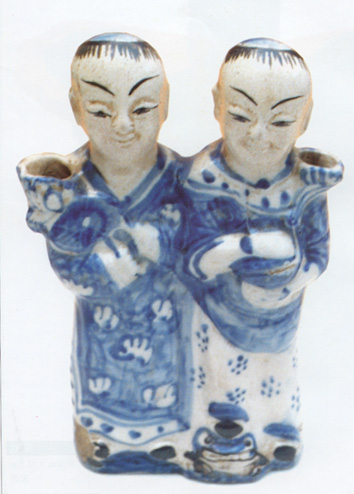 高27.5厘米,為傳統(tǒng)的“和合二仙”。造型概括,眉眼構(gòu)畫生動。此件小型瓷塑是用來插香之用的。