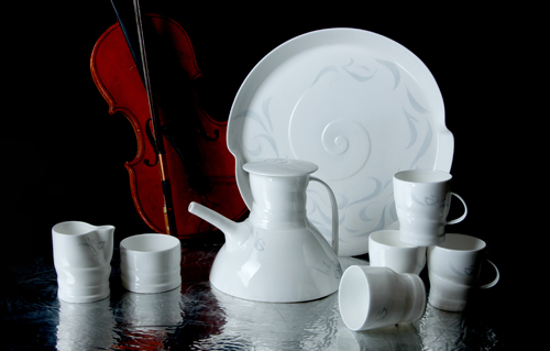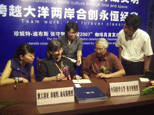 這套冠名為“和諧2007”的咖啡具,其造型由世界著名十大陶藝家之一、澳大利亞國立大學藝術(shù)系主任珍妮特?迪布斯設(shè)計,畫面裝飾則由被譽為中國瓷藝泰斗的清華大學工藝美術(shù)學院教授張守智創(chuàng)意。他們歷時一年半的切磋和磨合,在淄博華光瓷業(yè)有限公司的鼎力配合協(xié)助下順利完成。該作品全球限量發(fā)行200套,將被中國國家博物館、中國工藝美術(shù)館、澳大利亞國立美術(shù)館、中國陶瓷館收藏。