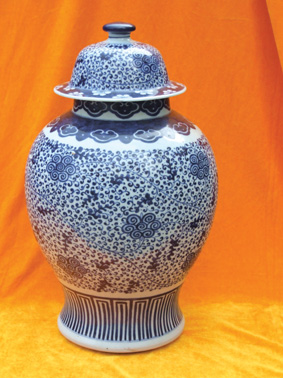 軍罐,是因其體形碩大、造型飽滿、氣魄雄偉酷似一位頭頂纓盔的將軍而得名。從元代由短頸大腹的無蓋大罐到明代的荷葉蓋罐逐漸演變形成,從存世的實物來考證,真正成熟的將軍罐是從明代嘉靖、萬歷時期開始,到了清代康熙年間官窯、民窯大量燒造。清代中后期更是備受推崇。將軍罐也由實用器皿逐漸發(fā)展為用來陳設(shè)裝飾、供奉避邪的藝術(shù)品。圖中這對清代中期的纏枝花青花將軍罐高45厘米,直口、豐肩圓胸,腹部漸收,器型飽滿,整體就像兩位戴盔披甲壯年的將軍,器型穩(wěn)重挺拔,威猛剛健。青花圖案自上而下共分七層,蓋子頂是藍色的圍棋鈕,往下用青花繪出2朵枝條纖細修長、花朵豐滿的纏枝花,在蓋子的折沿上用潑墨留白的手法繪出半隱半現(xiàn)的梅花,花朵分內(nèi)外兩圈。罐子的頸部是連續(xù)的如意紋,肩部用青花繪制的如意頭花邊披肩。作者在罐子的胸部與腹部巧妙地運用寫意的線描手法繪滿了濃淡相間的纏枝花,委婉流暢的曲線將花朵與葉子表現(xiàn)得婀娜輕巧。腰部以下是變形的回紋。這種莊嚴(yán)威武的造型與浪漫娟秀紋飾巧妙的配合,逐漸成為了大眾非常喜愛的風(fēng)格,這也是從清代乾隆開始一直到清末青花瓷上較為流行的典型紋飾。在對大量的新舊陶瓷標(biāo)本分析中發(fā)現(xiàn),新瓷的表面光澤與舊瓷的光澤存在著明顯的區(qū)別:古陶瓷的光澤由強到弱(逐漸切弱),雖然顯得暗淡,但過渡逐漸,比較自然。這對青花將軍罐的青花發(fā)色凝重、淡雅,圖案的邊緣比較朦朧、柔和。因為在上百年的歲月里,釉子因不可避免受到磨損、風(fēng)化、侵蝕而發(fā)生老化,釉子表面與內(nèi)部的老化與劣化改變了釉子的光學(xué)性能,釉子表面的光澤降低內(nèi)部的光澤加強,清晰度與透明度不斷下降,最后變成了一層毛化膜層,在毛化膜層的作用下,古陶瓷釉下的圖案也會變得柔美、凝重、典雅。特別是圖案的邊緣比較朦朧、柔和。而那些新仿瓷釉下的圖案就顯得清晰、單薄,缺少立體感,特別是圖案筆畫的邊緣比較銳利、清新。在這對青花將軍罐蓋子的鈕上能看到比較明顯的磨損,損傷是多年自然使用的痕跡,這個與人的使用習(xí)慣和器型有很大的關(guān)系。一般使用時人手經(jīng)常摸觸的地方以及放置時陶瓷與放置經(jīng)常接觸的地方往往磨損比較嚴(yán)重。凡是人手經(jīng)常觸摸的地方多是陶瓷器型凸起的外沿的“峰部”,觸摸較少的地方常是陶瓷器型凹陷的內(nèi)縮的“谷”或“溝”部。“峰部”越突出,凸起就越常受到磨損其光澤就越暗;無論新瓷經(jīng)過怎樣人為的打磨、去光,破壞的多是外部和外表,只是造成了表面的粗糙,它里面沒有被破壞的地方發(fā)光還是很亮。而古陶瓷的表面結(jié)構(gòu)的破壞和改變是一個漸進的漫長的過程,它遭受到的破壞是長期的。近年來隨著收藏市場的火爆,將軍罐成了收藏家們競相追逐的目標(biāo),但與花瓶等其他古玩不同,將軍罐是由罐子與蓋子兩部分組成,在百年的流傳過程中大多數(shù)身首異處,特別在文革“破四舊”的年代又因體積太大難以藏身而大量被毀,完整的傳世品較少,所以這一對原配的、完整無缺的清代纏枝花青花將軍罐更是稀有,彌足珍貴。