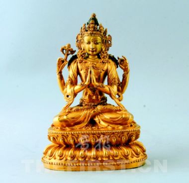 另外,“17世紀(jì)銅鎏金財(cái)寶天王”也是佛像中的精品,關(guān)于財(cái)寶天王的來(lái)歷,有兩種說(shuō)法,一說(shuō)即多聞天王,另一說(shuō)即是由金剛手所化現(xiàn)。通常人們都認(rèn)可后一種說(shuō)法。此尊佛像頭戴寶冠,身著鎧甲,足蹬戰(zhàn)靴,相貌威嚴(yán)。據(jù)傳,此尊能賜予眾生福慧和利益,故被奉為“財(cái)寶護(hù)法”。