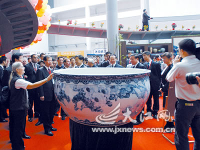 由景德鎮(zhèn)龍鳳陶瓷文化發(fā)展公司出品的“盛世名花”青花陶瓷大缸,10月18日正式在瓷博會(huì)開幕式上亮相。該瓷缸直徑1.66米,高0.8米,由景德鎮(zhèn)陶瓷技師余鵬飛手工拉坯、河北著名畫家、“中國牡丹王”崔廷玉繪畫,堪稱當(dāng)今世界之最。