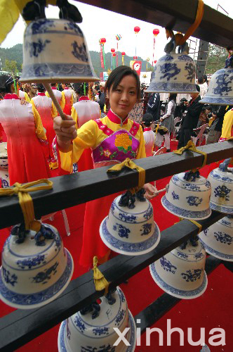 景德鎮(zhèn)歌舞劇團(tuán)瓷樂隊的演員在用瓷鐘演奏。