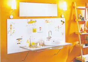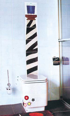 馬桶上方的墻面沒有很多空間可以自由有發(fā)揮,而且還要和馬桶搭配和諧。六片花磚組成的一組圖案,在設(shè)計中加入一些卡通的概念在里面,是使空間變得活潑的一種方法,而且在運(yùn)用時宜精不宜多。