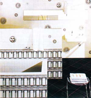 這里圍繞盥洗區(qū)安排了三副圖案,左上有一個鳥籠,下面是一把椅子,右邊是酷似羅馬柱上典型的意大利雕像,三個不相關(guān)的圖案組成一幅耐人尋味的畫面,這種將傳統(tǒng)融會于現(xiàn)代的畫風(fēng),與衛(wèi)浴間整體的設(shè)計搭配得天衣無縫。