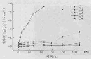 圖6 不同涂層電容值隨浸泡時間的變化曲線