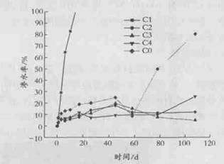 式中 Xv % 為有機涂層吸水體積百分率 ; C c (0) 、 C c ( T) 分別為浸泡 T 時間前后的涂層電容。在對阻抗譜數(shù)據(jù)進行解析求得 C c (0) 、 C c ( T) 之后 , 即可利用上式求得涂層的滲水率。本實驗中 , 涂層滲水率變化如圖 4 。由圖中可以看出 , 除 C1 由于防銹顏料加量過多 , 涂膜過早損壞外 , 在浸泡期間 , 涂層滲水率變化很小 , 說明涂層防護能力較強。