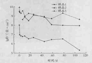 3 種涂料同時浸泡 108 d 。在整個浸泡期間 , 涂層 Nyquist 圖均為一個時間常數(shù) , 表明涂層還未被破壞 , 但從同期涂層阻抗值變化來看 , 它們的防護性能還是有差異的 , 其涂層電阻變化情況如圖 5 所示。