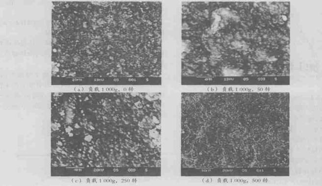 從電鏡圖中可見 , 當轉數(shù)為 0 時 , 界面平滑 , 見圖 7 (a) ; 當轉數(shù)為 50 時 , 涂層出現(xiàn)選擇性磨損而使填料凸出 , 見圖 7 (b) ; 隨著轉數(shù)的增加 , 填料凸出程度加大 , 見圖 7 (c) , 此時填料本身的耐磨性較好 , 而且由于它的突起還能在一定程度上阻止其背后膠體材料的磨損 , 產(chǎn)生選擇性磨損作用。但當轉數(shù)繼續(xù)增加時 , 填料開始破損 , 涂層損壞 , 見圖 7 (d) 。
