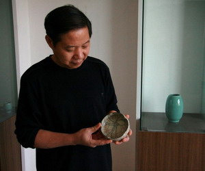在家務農(nóng)二十多年后,三十出頭的張紹斌才開始跟著叔公張高岳學做仿古青瓷,而且時間很短也只是學了兩三個月,后來就轉(zhuǎn)為自學。“當時學做仿古瓷純粹是為了養(yǎng)家糊口,到了96年,我仿古瓷已經(jīng)做得很好了,如果一直做下去,賺的錢肯定比現(xiàn)在多”,張紹斌開玩笑說。