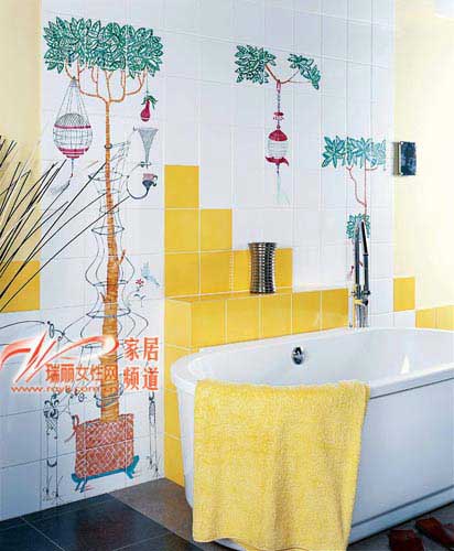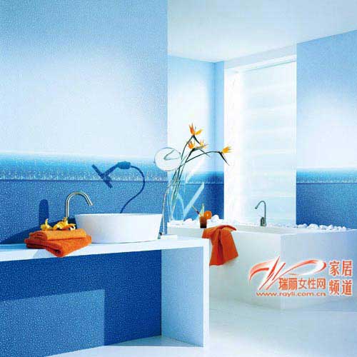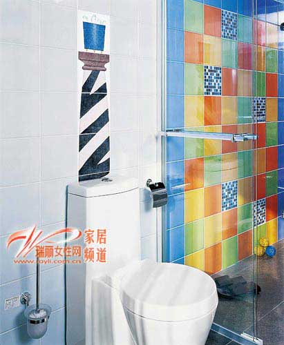 墻面上的絢麗打造,最容易為衛(wèi)浴生活營(yíng)造氣氛,也是炫彩衛(wèi)浴攻略中的重點(diǎn)。在封閉式設(shè)計(jì)的衛(wèi)浴間里,炫彩墻面以各個(gè)功能區(qū)的裝飾性主題墻的方式出現(xiàn)較好,可以是兩三種色彩的瓷磚組拼,也可以在局部區(qū)域貼彩色壁紙,馬賽克裝飾也是不錯(cuò)的點(diǎn)綴手段。