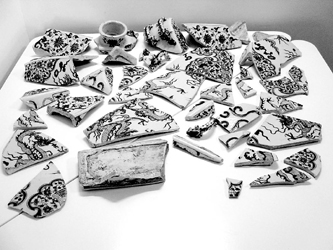 3個月前,一個收藏界朋友抱著這樣一具扁壺來找他,扁壺傷痕累累,表面的裂痕碎成哥窯一般,有些地方還有缺損,留下五六個小洞。蔣道銀接受了這個挑戰(zhàn)。他先將原件拆碎,一一清點,居然有40多塊。然后用藥水仔細清洗,再像拼圖游戲一樣拼裝起來。還得內(nèi)外兼修——先修一部分內(nèi)部,再修一部分外部,一層層修到口部。用的是強度很高的進口膠水,缺損處一一補上。更難的是用低溫仿釉材料將表面做平,還得用畫筆將青花圖案補齊。大家知道元青花圖案粗中有細,筆意恣肆汪洋,予人雄渾大氣的美感,這也是元青花的時代特征之一,今人書寫的材料與環(huán)境都發(fā)生了很大變化,要接通700年的時代氣息確實不容易。好在蔣道銀是老法師,數(shù)十年的修煉,早已得道,他懂得如何向元代的工匠借幾筆精神。如此,修了3個多月,他總算松了一口氣。