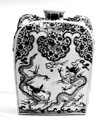 在元青花瓷器中,有一款四系扁壺,式樣相當獨特,它小口卷唇、溜肩、體呈扁長方形,肩部兩端向下垂到底,長方形砂底,兩肩各塑貼兩條龍,個別也有無系者或一對環(huán)形系。此類扁壺為元代特有,具有濃郁的異國情調(diào),并非中國傳統(tǒng)器物造型?梢韵胂蟮氖,在成吉思汗的馬隊向歐洲大陸飛沙走石進發(fā)的過程中,隨軍工匠們從西亞和歐洲的器物中捕捉到了靈感。這種中西文化的交流在中國的家具與建筑中也有不少例證。