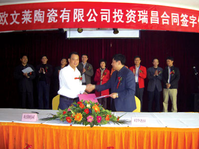 11月21日上午,在佛山陶瓷行業(yè)協(xié)會秘書長尹虹等人的見證下,佛山歐文萊陶瓷董事長梁偉鴻與江西省九江瑞昌市政府簽訂了一份投資金額達10個億的協(xié)議,確定在瑞昌市碼頭工業(yè)區(qū)新型建材工業(yè)基地圈地1080畝,并規(guī)劃上12條生產(chǎn)線,成為落戶該基地的第一家企業(yè)。作為江西省繼高安、豐城、景德鎮(zhèn)等幾家在建陶瓷基地之后的又一個新辟陶瓷基地,瑞昌市也開始進入佛山陶企外遷的視線中來。