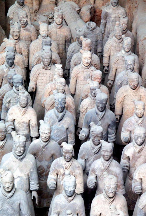 陶經(jīng)過了從灰陶、黑陶、白陶到印紋硬陶、彩陶的發(fā)展變化之路,在陶器的造型上也經(jīng)歷了由簡單到復雜、由粗放到精細、由平淡到生動的漸進過程。早期陶最負盛名的作品之一是出土于陜西臨潼秦始皇陵陪葬坑的兵馬俑,也叫秦俑。秦俑位于陜西臨潼附近,是秦始皇陵的一部分。自1974年開始,迄今已發(fā)掘了呈品字排列的三個俑坑,出土了真人大小的兵馬俑6000余個,其中有活馬大小的陶馬30余匹,戰(zhàn)車100余乘,組成了規(guī)模宏大的秦俑博物館。一號坑規(guī)模最大,長230米,寬62米,深5米,面積達14260平方米,是主力步兵戰(zhàn)陣,排列著一個一個整齊威武的軍隊方陣,間有雄健高大的戰(zhàn)馬。陶俑有士兵、馭手、鎧甲軍士、軍官、將軍,姿勢有立姿、跪射姿。二號坑略小,是騎兵戰(zhàn)陣,有戰(zhàn)車上千輛。三號坑最小,僅有六七十個軍官和將軍俑,似為指揮部。這些兵馬俑做工極其精良,須發(fā)畢現(xiàn),面部表情生動,姿態(tài)自然,衣紋流暢,顯示出嚴肅剛強、器宇軒昂的神態(tài),戰(zhàn)馬也敦實有力、蓄勢待發(fā)。這形象地證明了當時中國陶瓷技術達到了何等卓越的水平!這是一支為秦始皇死后護衛(wèi)的冥軍,為了建造它,老百姓付出了慘痛的代價,但是也為我們留下了這舉世矚目的珍寶,被譽為“世界第八大奇跡”!現(xiàn)任法國總統(tǒng)、當時的總理希拉克說:“不見金字塔,就不算到過埃及;不見兵馬俑,就不算到過中國!”