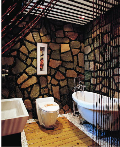 這種浴室中有的連天花板和墻面都飾以原木,木質(zhì)以涂清油為主,透出原木特有的木結(jié)構(gòu)和紋理,局部墻面用粗獷的毛石或大理石同原木相配,用石材特有的粗獷紋理打破木材略顯細膩和單薄的風格,一粗一細既產(chǎn)生對比,又營造出十足的不飾雕琢感。