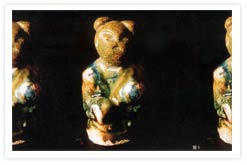 唐三彩樂伎(殘,頭部修復(fù))(圖1)。高8厘米。樂伎雙手擊鼓呈表演狀。白胎。藍(lán)、綠、黃棕四色釉,其中藍(lán)釉成色純正藍(lán)艷。