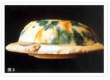 唐三彩(罐)蓋殘片(圖3)。尺寸為8厘米×5.5厘米。土黃胎略泛紅。藍(lán)、黃彩。釉下鈷藍(lán)點(diǎn)彩,成色青雅明快,暈散。