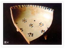 唐鈷藍(lán)點(diǎn)彩梅花紋飾殘片(圖4)。殘片大約是原碗的五分之二,有天有地,據(jù)此可推算出原碗的大小:高6.5厘米,口徑15.5厘米,足徑9厘米。敞口、鼓腹、圈足。胎色泛黃?谘匾遭捤{(lán)點(diǎn)彩,呈帶狀;碗心以鈷藍(lán)點(diǎn)為瓣,棕黃色點(diǎn)為蕊,組成梅花狀紋飾。鈷藍(lán)成色青藍(lán),暈散。