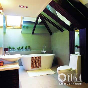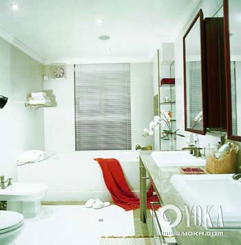 大量的白色,大量的直線條,雖然那條刻意“凌亂”的桔紅色浴巾給畫面增添了不少隨和,為了保持潔白色調(diào)的統(tǒng)一,甚至連浴缸邊的花、沐浴用的拖鞋和衛(wèi)浴間的排氣扇都注意到了?磥,衛(wèi)浴間的主人不會輕易對自己的要求打折扣,只要條件允許就會務(wù)求盡善盡美。直線條在視覺上是“堅硬”的,衛(wèi)浴間里也沒有絲毫用來掩飾的設(shè)計,表現(xiàn)出坦蕩直率而不茍且。衛(wèi)浴間主人這種缺乏掩飾的個性搭配上稍許的完美傾向,活脫脫像一個不羈的詩人。