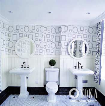 那是個抽水馬桶嗎?它難道不更像一個寶座嗎?不但馬桶本身居于嚴(yán)格對稱的布局正中,就連唯一的植物都在強調(diào)著這個抽水馬桶的不可一世?瓷先ィ@個衛(wèi)浴間更像是以這個馬桶為中心設(shè)計的。在馬桶周圍不僅強調(diào)格局的對稱,而且到處都是圓形和方塊。這兩種圖案鋪滿了墻壁,就連鏡子和盥洗池都是。再加上整齊排列的頂燈和墻圍上的大量的直線條,這個衛(wèi)浴間的主人是個有點自我中心的人,他重視自己的地位和權(quán)威,嚴(yán)謹(jǐn)而不散漫。