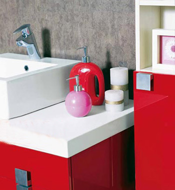 配有紅顏色浴室家具的衛(wèi)浴間,梳洗臺(tái)上可選購(gòu)幾件紅色系的盥洗用品,擺在臺(tái)面上很好看,而且還能和家具的顏色形成呼應(yīng)