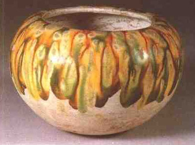 x 簡稱唐三彩,唐代(618~907年)生產(chǎn)的用高嶺土作胎,施黃、綠、藍(lán)、褐等多種色釉燒制而成的低溫釉陶器物。唐三彩是利用礦物質(zhì)中的金屬氧化物的呈色機(jī)理燒制而成的,以氧化鉛為助熔劑,在釉科中適量加入銅、鐵、鈷、錳等物質(zhì)作著色劑,在900℃溫度中銅的氧化物呈現(xiàn)綠色,鐵的氧化物呈黃或黃褐色,鈷的氧化物呈現(xiàn)藍(lán)色,錳的氧化物呈現(xiàn)紫黑色。在這些釉色的基礎(chǔ)上又成功地?zé)瞥龀赛S、深綠、赭色、茄紫等色彩,反映出唐代多彩陶器是在單彩陶器的基礎(chǔ)上發(fā)展而來的。唐三彩始燒于唐高宗時(shí)期,玄宗開元、天寶年間是三彩器發(fā)展的頂峰時(shí)期,這時(shí)三彩種類繁多。造型生動(dòng)優(yōu)美,釉色絢麗多彩、在長安、洛陽的唐墓中出土最多,江蘇揚(yáng)州、山西、河南、甘肅也有出土。天寶之后三彩器逐漸減少,唐晚期三彩器幾乎被瓷器所取代。唐三彩的制作工序如下;一、選料,三彩器很注重造型和釉色,因此對(duì)胎料選擇不精,胎質(zhì)中含有石英顆粒等雜質(zhì)。二、成型,用模制或輪制及捏塑粘接的方法成型、為掩蓋胎質(zhì)精糙,突出釉色,往往成型后再罩化妝土。三、素?zé),將陰干的坯胎?000℃左右的溫度燒堅(jiān)。四、掛釉,按事前所設(shè)計(jì)的圖案調(diào)配釉料上釉。五、低溫?zé),各色釉藥?00℃溫度燒造過程中,釉汁熔融流動(dòng)相互浸潤形成斑斕的色彩。六、開相,在不著釉的陶俑頭部以朱涂唇、以墨畫出眉毛、眼睛、頭發(fā),增強(qiáng)陶俑形態(tài)的神韻。唐代盛行厚葬,大小唐墓中出土三彩器甚多,反映出唐代社會(huì)生活的方方面面。根據(jù)已發(fā)表考古資料分析,唐三彩的器物類別,如生活用品,主要有瓶、壺、罐、缽、杯、盤、盂、燭臺(tái)、硯、枕等;模型,有亭臺(tái)樓榭、仿木箱柜、住房、倉庫、廁所、牛、馬車等;俑,有各種人物與動(dòng)物,如貴婦、達(dá)官、男女侍、武士、天王、胡人及馬、駱駝、豬、羊、雞、狗等。唐代陶塑藝術(shù)成功之作也多表現(xiàn)于三彩作品中。如西安郊區(qū)鮮于庭誨墓出土的三彩駱駝?shì)d樂舞俑,是唐三彩中的佼佼者,造型獨(dú)特,釉色絢麗,人物形態(tài)逼真,是難得的稀世珍寶。公元8世紀(jì),唐三彩作為—種商品與越窯青瓷、邢窯白瓷一并通過海上絲綢之路運(yùn)往亞非各國,在印度尼西亞、朝鮮、日本、埃及等國家都出土有唐三彩。9~10世紀(jì)朝鮮、日本、埃及等國也在唐三彩的啟發(fā)下成功地?zé)隽司哂斜緡厣木赖蜏夭视蕴掌魅缧铝_三彩、奈良三彩等。(見下圖)