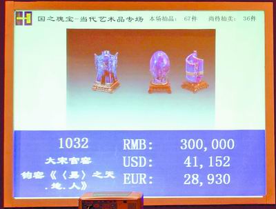 人民網(wǎng)河南視窗訊 大河網(wǎng)—大河報(bào)報(bào)道:昨日上午,在北京嘉里中心酒店二樓舉辦的翰海2007秋季拍賣(mài)會(huì)上,短短的40秒內(nèi),兩位神秘買(mǎi)家輪番競(jìng)價(jià),隨著拍賣(mài)槌“當(dāng)”聲落定,拍賣(mài)師宣布我省參加拍賣(mài)的大宋官窯鈞瓷《〈易〉天·地·人》系列作品以35.3萬(wàn)元成交,創(chuàng)下鈞瓷當(dāng)代工藝作品的最高拍賣(mài)價(jià)。