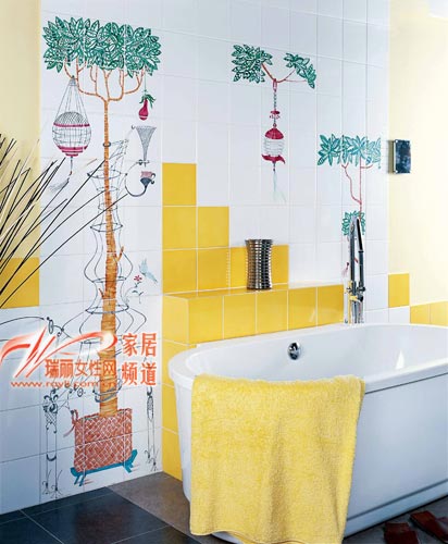 墻面上的絢麗打造,最容易為衛(wèi)浴生活營造氣氛,也是炫彩衛(wèi)浴攻略中的重點。在封閉式設(shè)計的衛(wèi)浴間里,炫彩墻面以各個功能區(qū)的裝飾性主題墻的方式出現(xiàn)較好,可以是兩三種色彩的瓷磚組拼,也可以在局部區(qū)域貼彩色壁紙,馬賽克裝飾也是不錯的點綴手段。 彩色潔具 打造活力衛(wèi)浴間