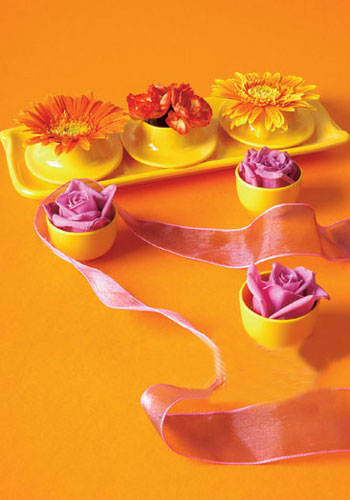 糖果色茶具不僅為飲茶帶來很多樂趣,還可以成為裝飾房間的特別之選。用綻放的鮮花填滿茶杯,再將一條漂亮絲帶盤繞在茶杯之間,讓它們?yōu)榉块g營造出一處富有情調(diào)的小景觀。