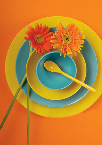 顏色亮麗的餐盤搭配在一起,表露夏末秋初熱烈而富有魅力的季節(jié)主題。在色彩斑斕的餐盤之間點(diǎn)綴上橙色鮮花,讓夏末充滿快樂的家庭氣氛變得更加富有生機(jī)。