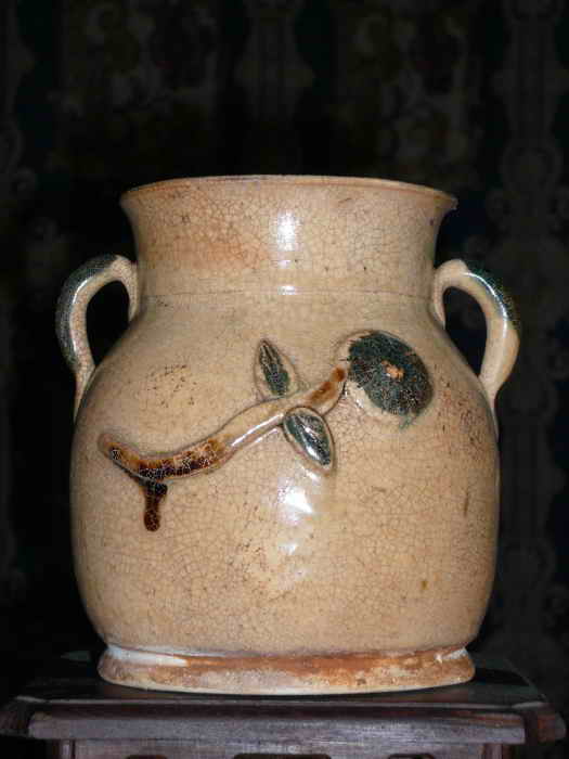 地處安徽省西南、長江中下游北岸的安慶地區(qū),墓葬中時有長沙窯器物出土,品種有壺、罐、碗、玩具等等。這是懷寧縣一唐代墓葬中出土的一件長沙窯褐綠彩雙系罐。此雙系罐高18.5厘米,口徑15厘米,腹徑17.5厘米,直頸,口沿外侈,窄肩,直腹,底部內(nèi)凹,肩貼雙系,雙系兩面用褐綠彩點繪相似的斜方形狀圖案紋飾,斜方紋內(nèi)用綠彩點繪波浪紋。整件器物形體大方,修胎規(guī)整,釉層瑩潤光滑;為襯托出彩料的成色,達到其彩繪美的效果,器物胎上涂有一層化妝土,起到了增強胎體的致密度和增加瓷胎白度的作用;同時紋飾采用點、線表現(xiàn)手法,水墨暈散效果的抽象圖紋,給人以豐富的想像空間。是一件難得的唐代長沙窯珍品,2004年安徽省文物鑒定站鑒定為國家二級文物,現(xiàn)收藏于懷寧縣文物管理所。