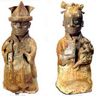 左圖為越窯青瓷武士俑,右圖為越窯青瓷仕女俑