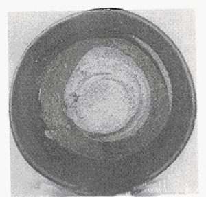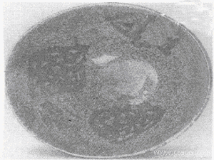 晚期仿品吸取以往經驗,有埋人土中“過蝕”、在成品上涂膠過火仿土銹制造假象者。土銹靠膠粘附,干燥時無異樣反應,但見水易化,甚至脫落,用手指沾水,哪怕沾點唾沫涂于銹面,手指沾有土色者為人為土銹。
