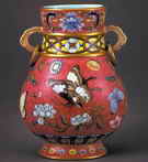 粉彩是由康熙時(shí)期所發(fā)展出來的一種新的彩釉配方,粉彩事實(shí)上就是把西方的琺瑯釉中的硼元素,換成我們中國釉上彩的鉛元素而配出來的。由于三氧化二砷在鉛釉中會(huì)起白色半透明的乳濁作用,若再加上發(fā)色劑便有失透明感,使色彩似有加白粉的效果,所以稱為粉彩,也有人俗稱「軟彩」。粉彩由于彩中有砷白的關(guān)系,色料凸起很高,較有立體感。干隆時(shí)期在釉彩方面也有特殊的作法,如此件以深紅彩為地,細(xì)線剔劃卷草紋,再繪以四季花卉、蝴蝶,色彩繁多,充分表現(xiàn)出花蝶逼真的姿態(tài)。