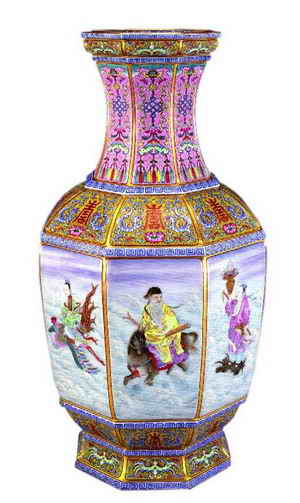 乾隆朝是古代最為繁榮富庶的朝代,當(dāng)時的工藝品極盡工巧,裝飾風(fēng)格追求全滿,具有“無物不吉利,無語不吉祥”的特點。嘉德2006春拍,一件乾隆粉彩開光八仙過海圖盤口瓶以5280萬人民幣成交。此器為乾隆官窯器,瓶身裝飾圖案富麗華貴,構(gòu)圖繁密,瓶頸部繪粉彩盤結(jié)、磬、纓絡(luò)紋寓意“福壽吉慶”,瓶腹八面開光內(nèi)繪“八仙過海”圖,這些顯然都是為了取悅乾隆皇帝而精心構(gòu)思的。既是皇帝御用瓷器又有非常吉祥的圖案裝飾,這都決定了它的不菲身價。