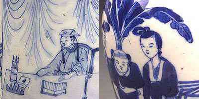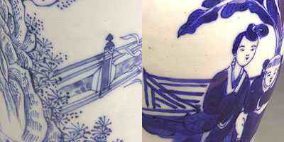 第二組圖片:注意樓閣和樹石的線條,康熙瓷剛勁有力,青花濃淡變化明顯。光緒瓷線條軟弱,青花層次不清晰。