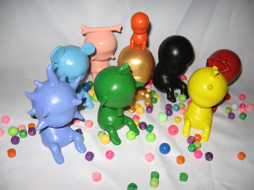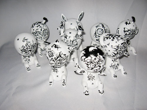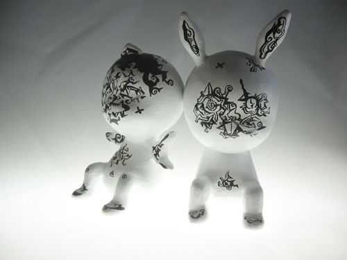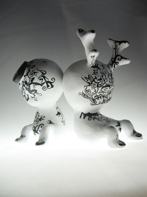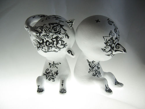 QRUWI是小不點的意思,EMBRYO寓意新生事物。“QRUWI EMBRYO”的創(chuàng)意來源于嬰兒,9個小瓷人實際是9個被高度概括的嬰兒形態(tài),沒有面部和上肢,每個小人的動態(tài)和體形都非常接近,但有的有一對兔耳、有的有天使的翅膀、有的多出一只手來,這些細微的差別又決定了它們之間的不同。