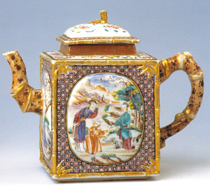廣州博物館收藏有一件廣彩“錦地開光人物紋方形茶壺”,此壺為清朝乾隆時(shí)期的作品。它通高18.5厘米,口徑7.2×5.1厘米,足徑9.8×8厘米。茶壺造型獨(dú)特,其壺柄、壺嘴、壺邊及壺蓋的四邊和蓋鈕皆為竹節(jié)造型,每面的邊角上還裝飾著竹葉。壺的四面皆以橢圓形開光,中間繪有古代人物故事,其中一面為兩個(gè)婦女和一個(gè)孩子:兩個(gè)身著束腰長(zhǎng)衫、發(fā)髻向上梳的女子,一個(gè)站著一個(gè)坐著,似在教育孩子。