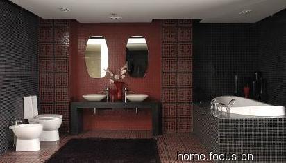 中國(guó)紅與黑色的瓷磚裝點(diǎn)著整個(gè)空間,浴室柜所在背景墻為紅色,而兩側(cè)潔具與浴缸的背景墻則為黑色,兩者相互呼應(yīng),相互補(bǔ)充。紅黑相間的回字紋拼圖磚作為兩種顏色中間的過(guò)渡,使之渾然一體。設(shè)計(jì)師通過(guò)色彩的組合搭配,有效的將浴室的功能區(qū)域劃分。