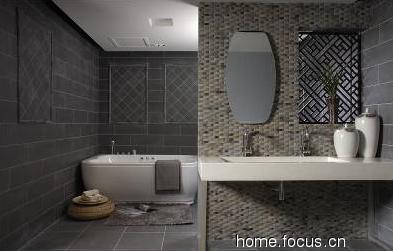 “秦磚漢瓦”在整體設(shè)計(jì)中,延用了中式內(nèi)斂的風(fēng)格特點(diǎn),運(yùn)用貫穿式主題墻的理念,實(shí)現(xiàn)了浴室的干濕分區(qū)。墻面上斑駁的瓦片磚,帶著歲月流逝后滄桑的痕跡。浴鏡右側(cè)的墻體被創(chuàng)意性地挖空,取而代之一扇實(shí)木中式窗花,依稀可見(jiàn)傳統(tǒng)中式古典主義之風(fēng)。浴室外部采用了寬大的天然石臺(tái)面代替浴室柜,拋棄一切多余的線條和裝飾,彰顯出主人的高雅品味。內(nèi)部則采用白色矩形按摩浴缸,在浴缸和潔具向上延升的墻面均以45度斜向鋪貼了與整個(gè)空間同色系的小磚,并以瓦楞磚收口,是典型的中國(guó)四合院設(shè)計(jì)方式,營(yíng)造出濃重的中式主義風(fēng)格。