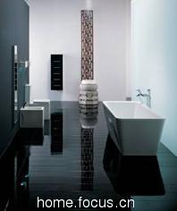 中國(guó)印象采用整體方正的直線條設(shè)計(jì)風(fēng)格,端正穩(wěn)健,格調(diào)高雅,充分體現(xiàn)出中統(tǒng)美學(xué)精神。中規(guī)中矩的三面產(chǎn)品布局設(shè)計(jì),將實(shí)用主義與融合性設(shè)計(jì)相結(jié)合,中式經(jīng)典得以現(xiàn)代版演繹。浴鏡與面盆設(shè)置方式為中國(guó)式的完全對(duì)稱,黑色U型浴室柜方正簡(jiǎn)潔、渾然大氣,與整個(gè)空間的瓷磚完美地結(jié)合,體現(xiàn)出濃厚的古典氣息。兩側(cè)的裝飾柱擎天而立,橫跨整個(gè)空間,明朗寬闊、大氣奢華。所有的潔具、面盆、浴缸均采用圓弧造型,和空間的方形瓷磚形成鮮明對(duì)比,簡(jiǎn)約的造型給人最本質(zhì)的感官享受。