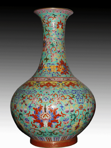 清嘉慶  孔雀藍(lán)地粉彩花卉紋瓶,高:27.2厘米,此瓶采用了黃金線條和粉彩結(jié)合的,瓶型大方,雅觀,工藝精湛。圖案是蓮花和蝙蝠為主題,采用纏枝和它們相連的,這是吉祥的圖案,是送禮和收藏的好佳選
