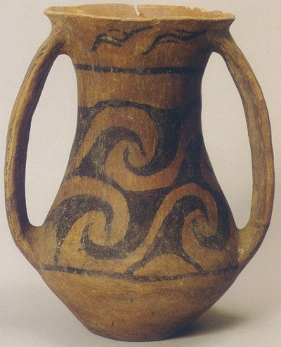 彩陶大雙耳罐。辛店文化泥質(zhì)黃陶。口頸部與腹部為對稱雙耳相連接,使造型貫通一氣,器身虛空間比例合理。器表施用紅色陶衣,飾以黑色渦紋,華麗大方。