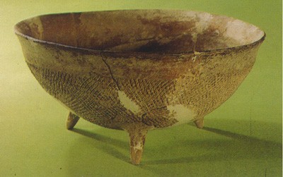 寬帶紋三足缽大地灣一期文化。大地灣文化亦稱老官臺(tái)文化,發(fā)現(xiàn)于甘肅省東部,距今八千年至七千年,是世界上最早出現(xiàn)的新陶文化。