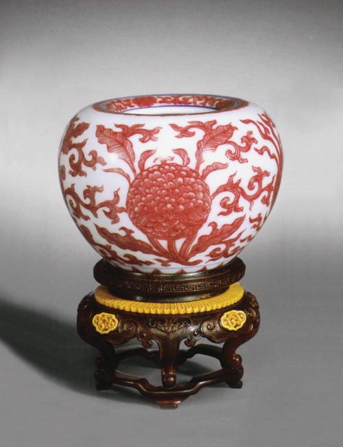 宣德時期的釉里紅瓷也頗為成功了,擺脫了元末那種黑紅、粉紅的晦暗色調(diào)。而且宣德時對銅紅釉的燒造技術(shù)掌握得較好,紋飾清晰,色澤鮮艷,被稱為“寶石紅”。
