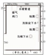 衛(wèi)生間很小,長邊2.1M,短邊僅1.5M,但主人需要在衛(wèi)生間設置諸多功能:蹲坑、淋浴、洗手盆、小洗衣機、墩布池等,而且,要求盡量不改動下水位置。