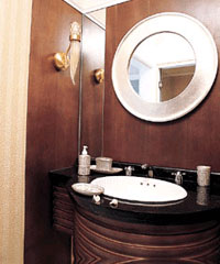 整體風(fēng)格:選用了中國傳統(tǒng)家具中多見的黑色為主色調(diào),整體效果沉穩(wěn)大氣。雙人面盆使用起來舒適而不擁堵。因為空間較大,所以使用了浴缸,與主人的身份也很相符。整個設(shè)計中,墻面以豎線條為主,這樣使人感覺層高增加,擴(kuò)大了衛(wèi)生間縱向的空間感。