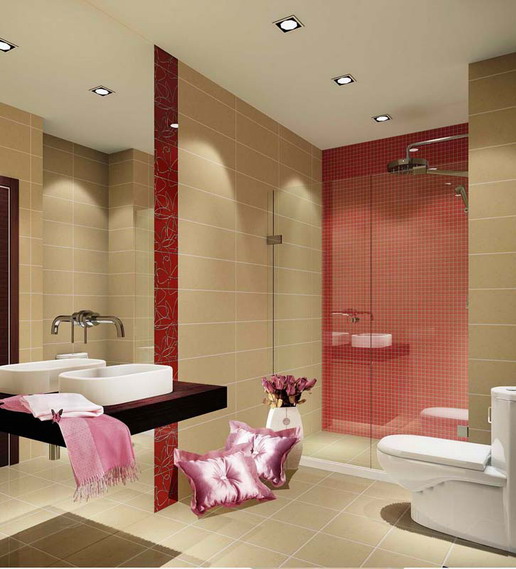 在大浴室中用墻面分隔區(qū)域是個值得稱道的小計謀,平凡的米色墻面和地面雖然干凈但并不出奇,但加上一條Art deco風格的紅色裝飾線就大大不同,轉瞬間就成為浴室中最惹眼的設計,瓷磚顏色和圖案成為女性