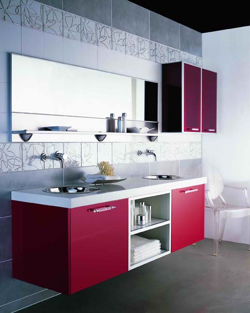 把盥洗區(qū)安排在正對著浴室門的位置,這樣既美觀又能突出浴室的風格,所以主題墻的作用就相當重要,也是浴室風格的有力代言。紅色烤漆的浴室家具將女性主張表露無疑,為了使風格更加精致,鋪貼白色Art Deco風格的瓷磚來烘托氣氛,塑造浴室的小資情調。